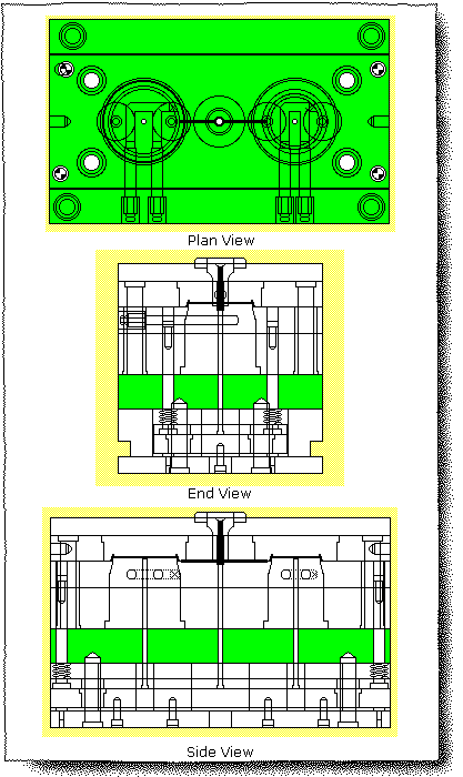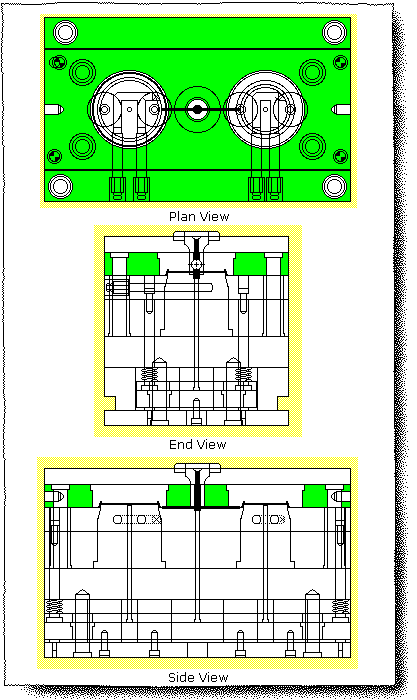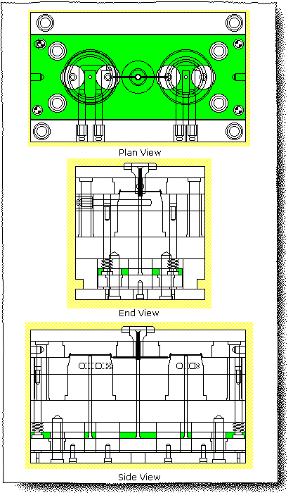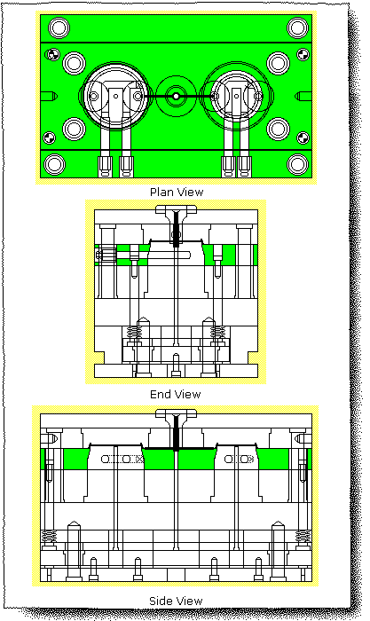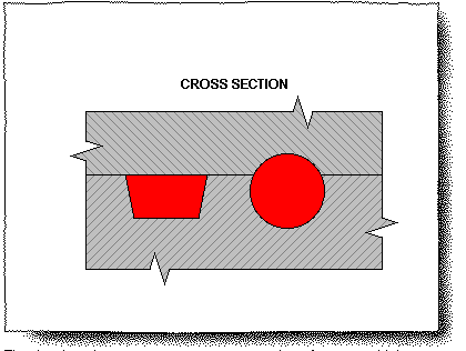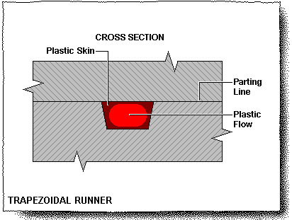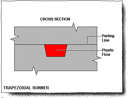 This sketching shows a cross-section of a trapezoidal runner engraved directly into the P/L of a mold base. Be aware that the entire runner is engraved in one plate. The runner is stripped out from the mold base along with the component.
