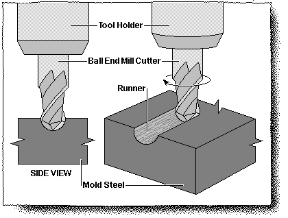 [/ezcol_1half][ezcol_1half_end]This illustration represents the method employed to engrave one half of the round runner into the mold steel .A very hard ball end mill cutter and its fixer are spun in the spindle of a milling equipment. The cutter marks left over the runner surface must be eliminated through polishing with rotary abrasives.