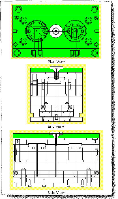 The sketch shows a cross section view of a entire spherical runner produced directly into the P/L(parting line) of a mold base. Be aware that half of the runner is in the top plate and the other half of the runner is incorporated in the bottom plate. The runner is stripped out of the mold base with the molded part.